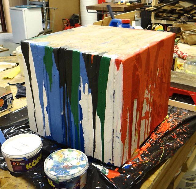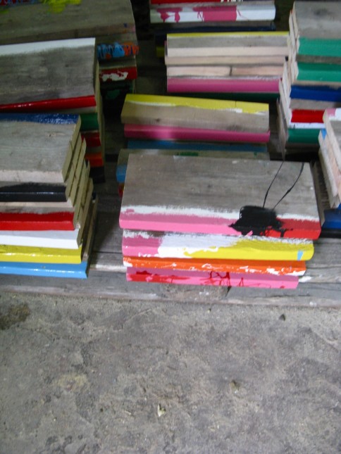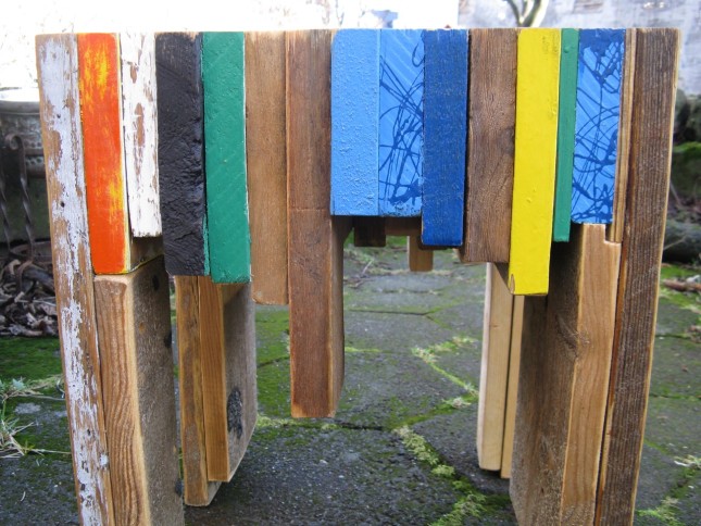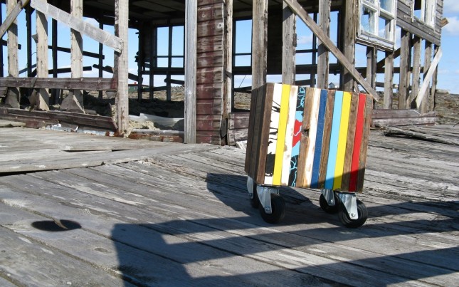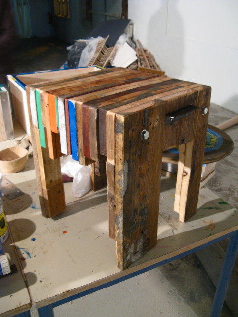Our reclaimed wood stools are individually crafted with shipping paint, reclaimed canvas, embroidery and anything that flows our way. We create most of them with wheels attached because it is our belief that mobility is a source of great fun and play , in addition to providing and important outlet for stagnant energy.